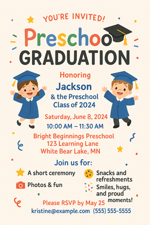 Printed invitations naturally create a more formal and memorable experience than digital-only communication. You can elevate these materials further by including student photos or short messages and quotes from teachers. These printed pieces work perfectly for direct family invites and broader community announcements, doubling as beautiful keepsakes.